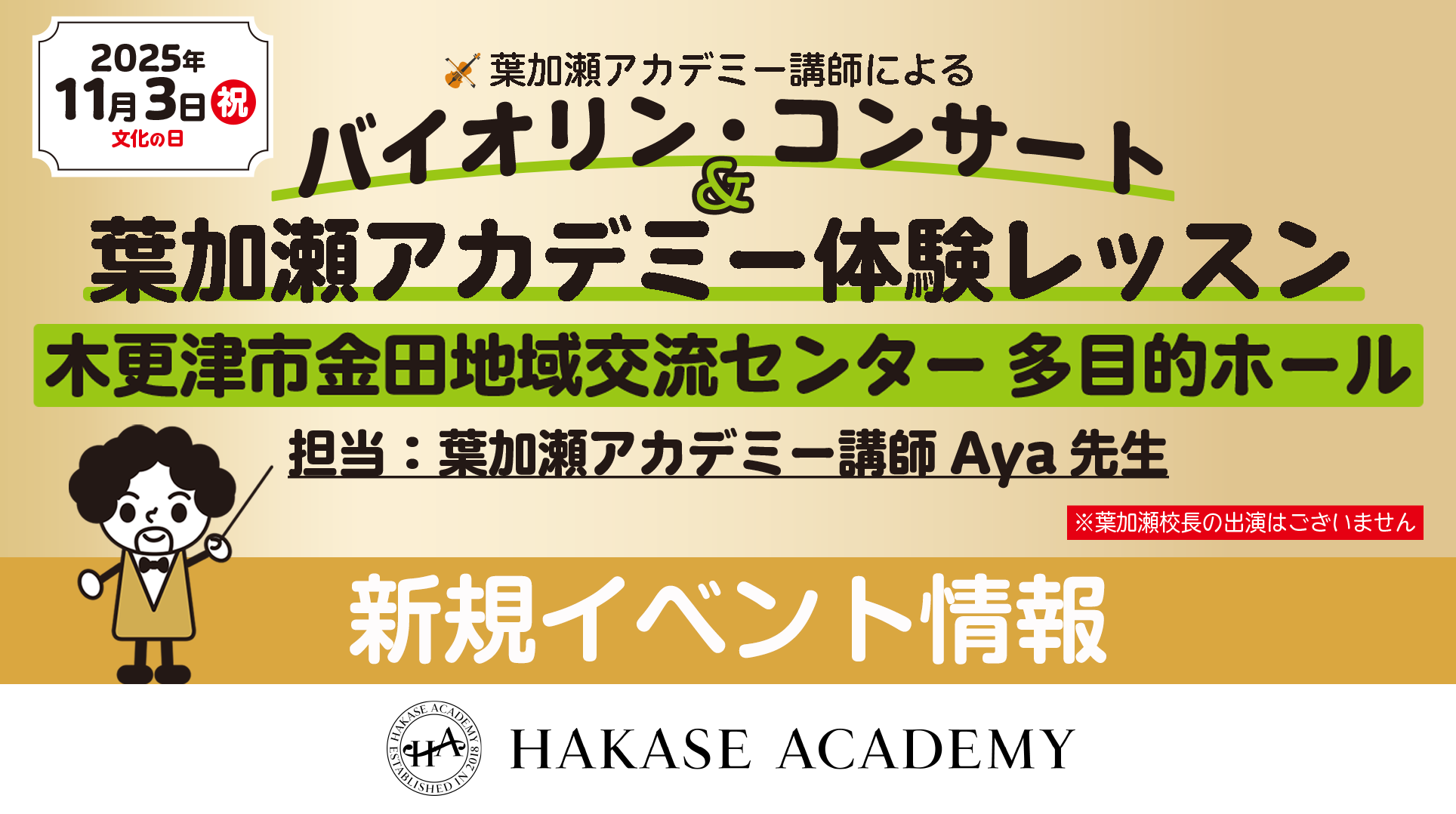 こんにちは。葉加瀬アカデミー専属バイオリニストのAyaです。