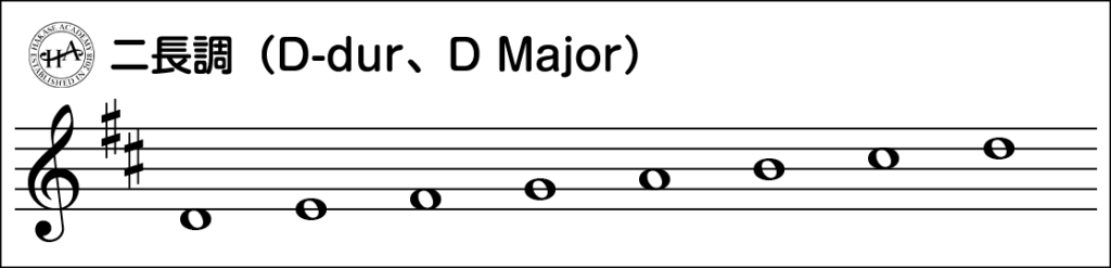 上記のように、どの音から始まっても全音と半音の音程を変えないよう並べなくてはいけないのです。「レ」から始まる場合、ファとドの音が♯です。この場合、ファとドの音が調号になり、♯2個=ニ長調という呼び方をします。