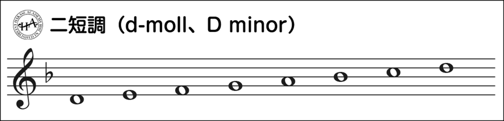 上記のように、どの音から始まっても全音と半音の音程を変えないよう並べなくてはいけないのです。「レ」から始まる場合、シの音だけが♭です。この場合シの音が調号になり、♭1個=ニ短調という呼び方をします。